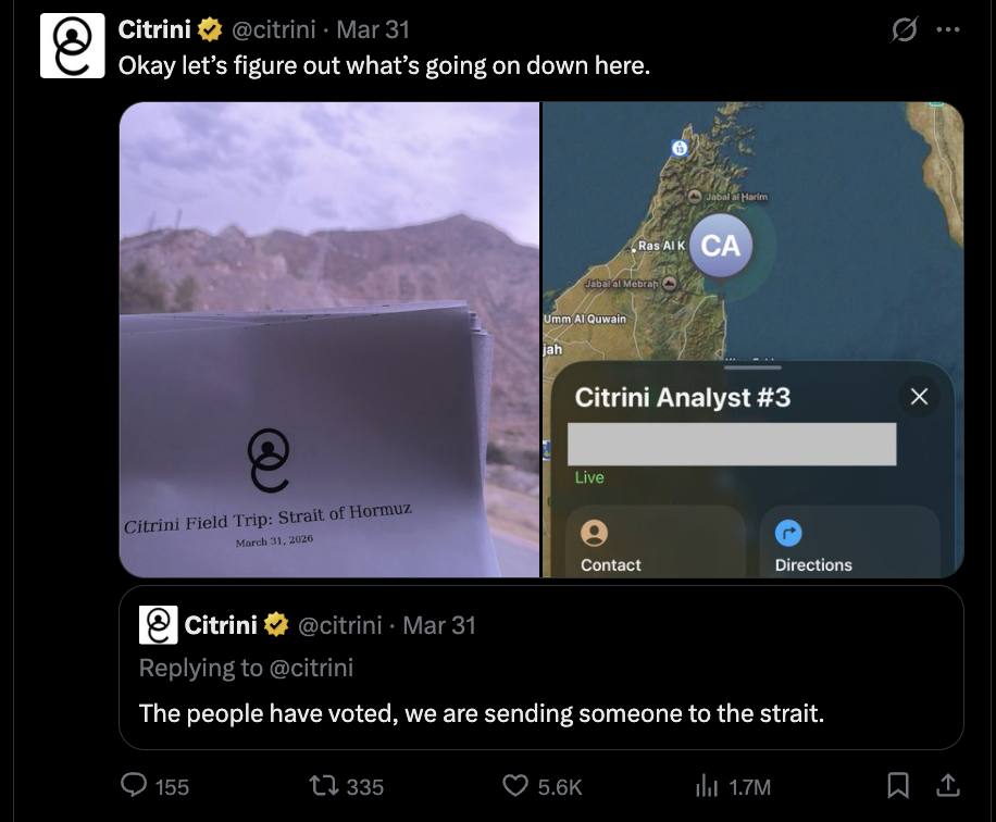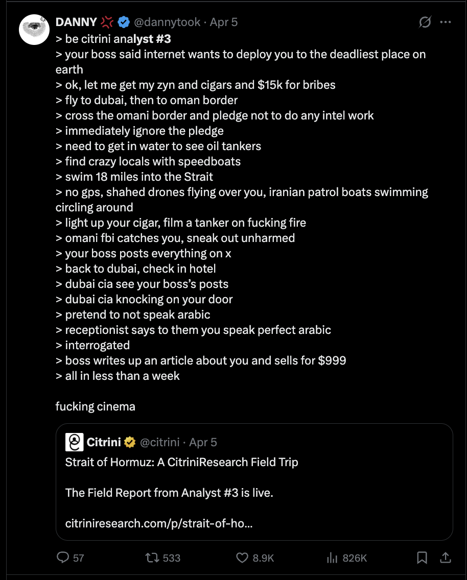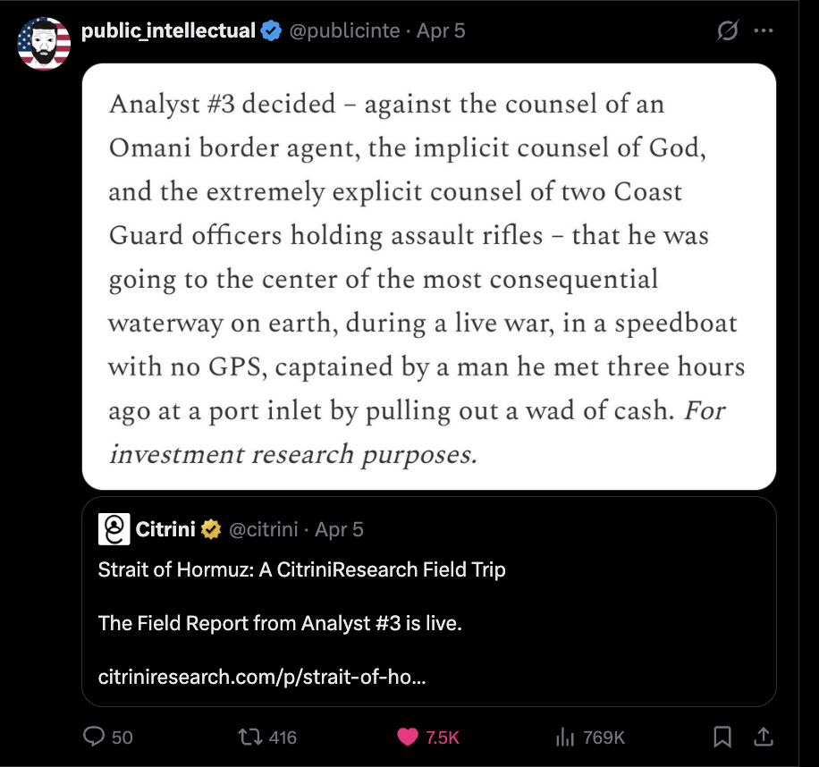 This grant programme is named after Analyst #3 at Citrini Research, who crossed the most consequential waterway on earth in a speedboat with no GPS, during a live war, for investment research purposes.[1]
